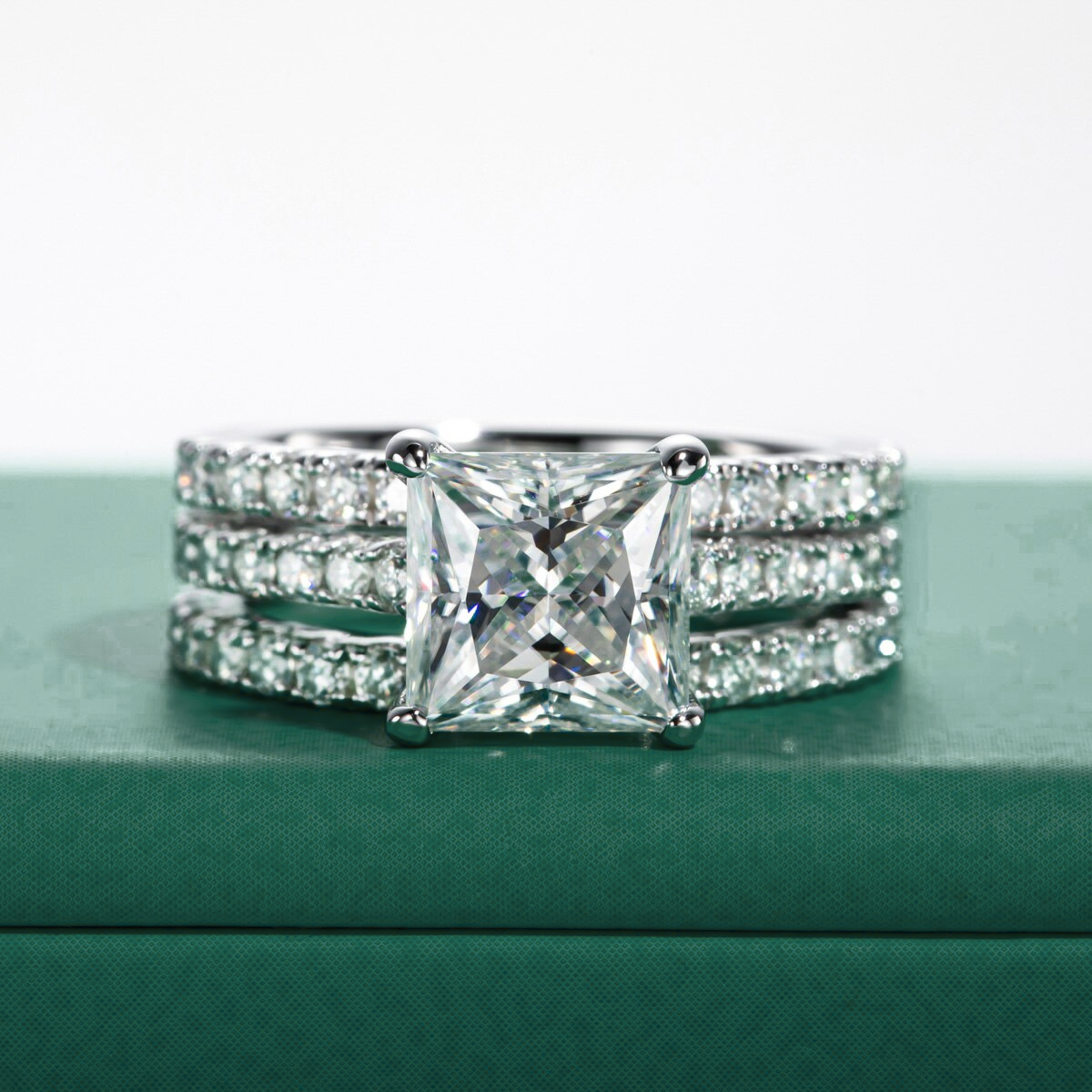 This elegant set combines a princess-cut solitaire with a sophisticated half band, creating a stunning and timeless look. The 3ct central moissanite shines brightly with its princess cut, while the side moissanites on the half band complete the design with a touch of refinement. The piece is crafted in 925 sterling silver with rhodium plating and 18k white gold, providing superior shine and durability.