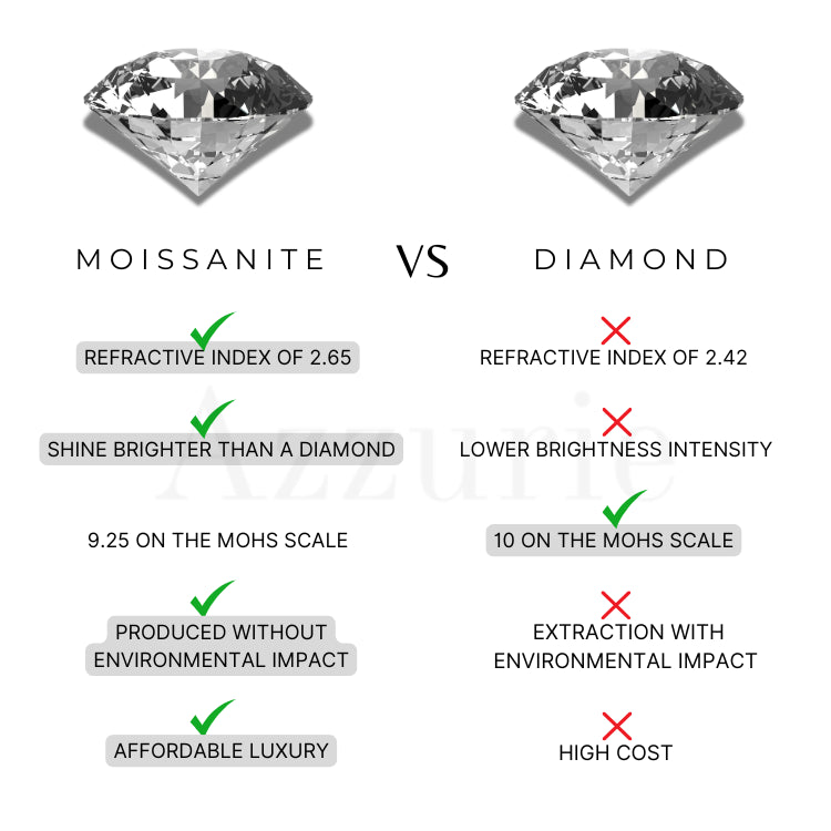 Moissanite carries a refractive index of 2.65. Diamond sits at 2.42. This isn't marketing — it's optics. More fire, more light dispersion, more brilliance visible to the naked eye. A lab-grown gem with the same hardness and resilience as diamond, without the conflict and without the cost that exists only because the market decided it should.