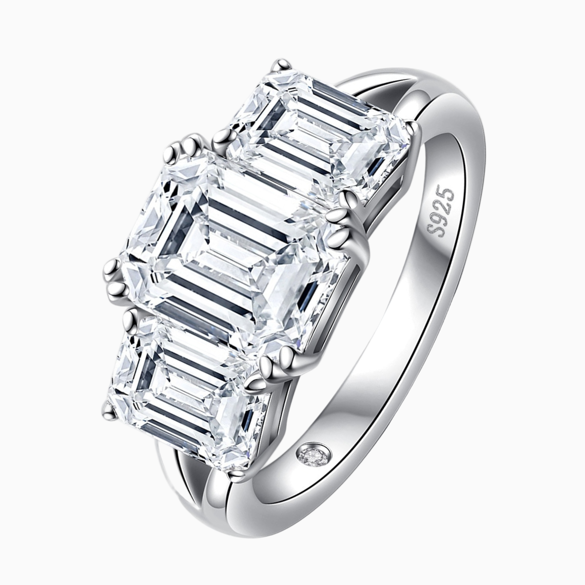 This ring is a masterpiece of elegance and brilliance, featuring a 3.0-carat emerald-cut central moissanite. Complemented by 1.0-carat emerald-cut side moissanites, totaling 5 carats. Crafted in 925 silver with rhodium and 18k gold plating, the ring offers a sophisticated and durable finish.